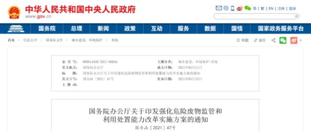 國務院辦公廳關于印發強化危險廢物監管和 利用處置能力改革實施方案的通知