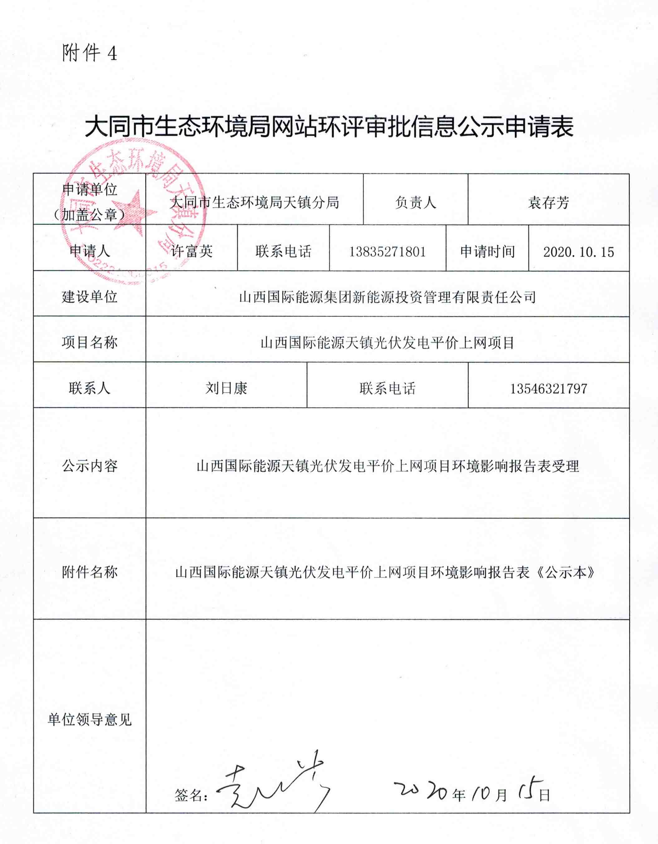 大同市生態環境局天鎮分局關于2020年10月15日建設項目環境影響評價文件受理情況的公示